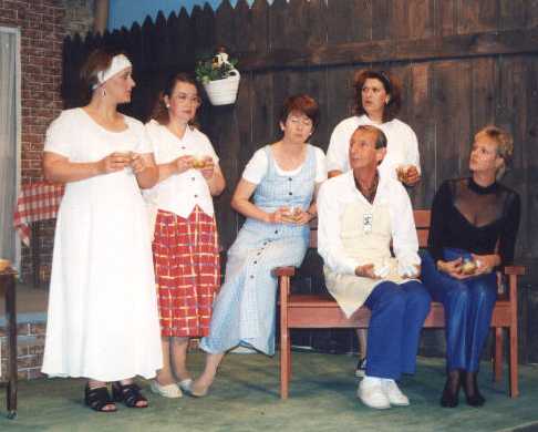 Sitting L to R: Janette Hendry as "Deidre", Karen Beale as "Roz", Vicci Matheson as "Joyce", Paul Woods as "Derek", Sylvia Nagle as "Pearl"